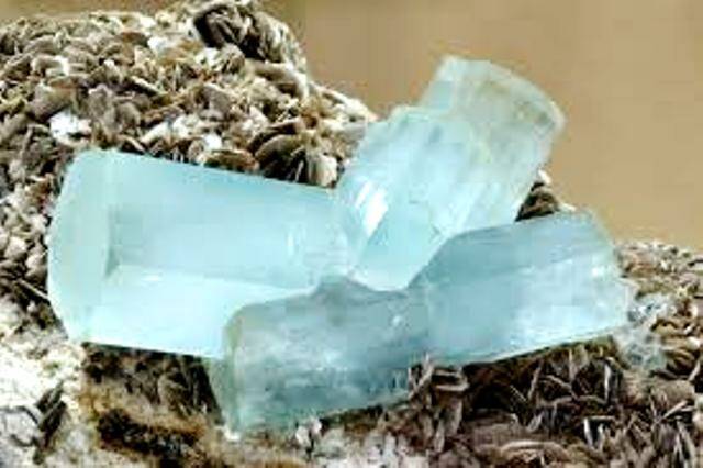 Aquamarijn in moedersteen uit Pakistan Het Ontladen van de Aquamarijn: