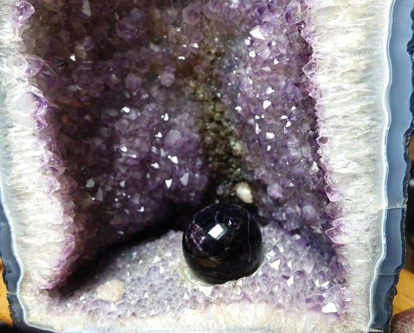 Mooie Amethist geode met bol . kijk voor de werking op de site.
