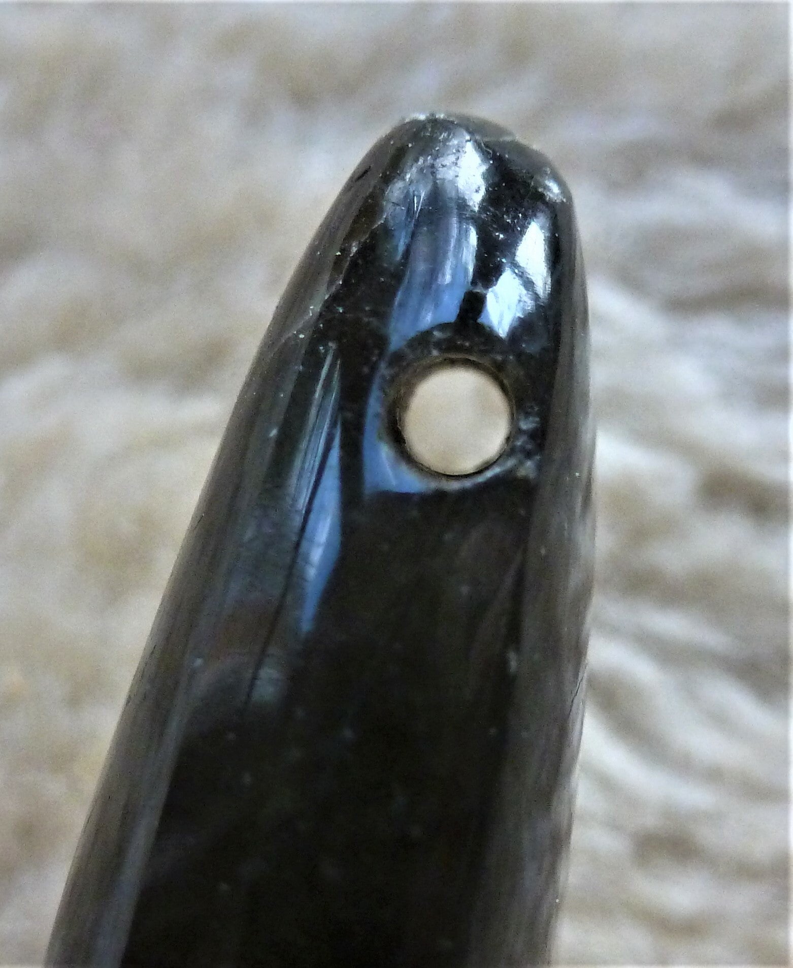 De steen is doorboord en kan met een touwtje gedragen worden.